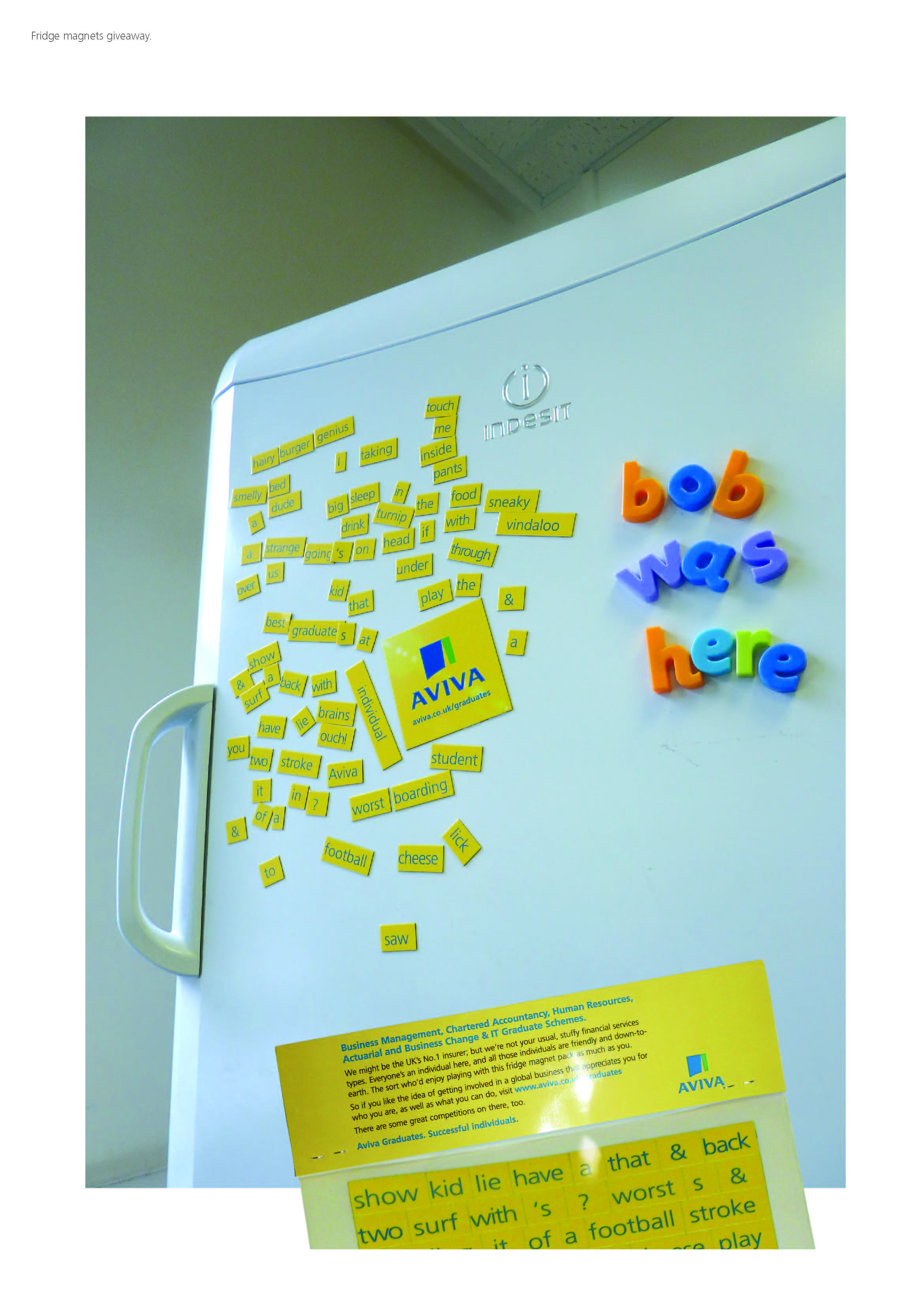 Then, we put together a more ‘individual’ solution for the client’s graduate roadshow stand. We designed a Pick’n’Mix brochure, letting students choose sections of pages from a rack that they felt they actually needed: an approach that helped with green credentials too. And for a giveaway, fridge magnets that let students created their own inspirational messages for themselves and their housemates.