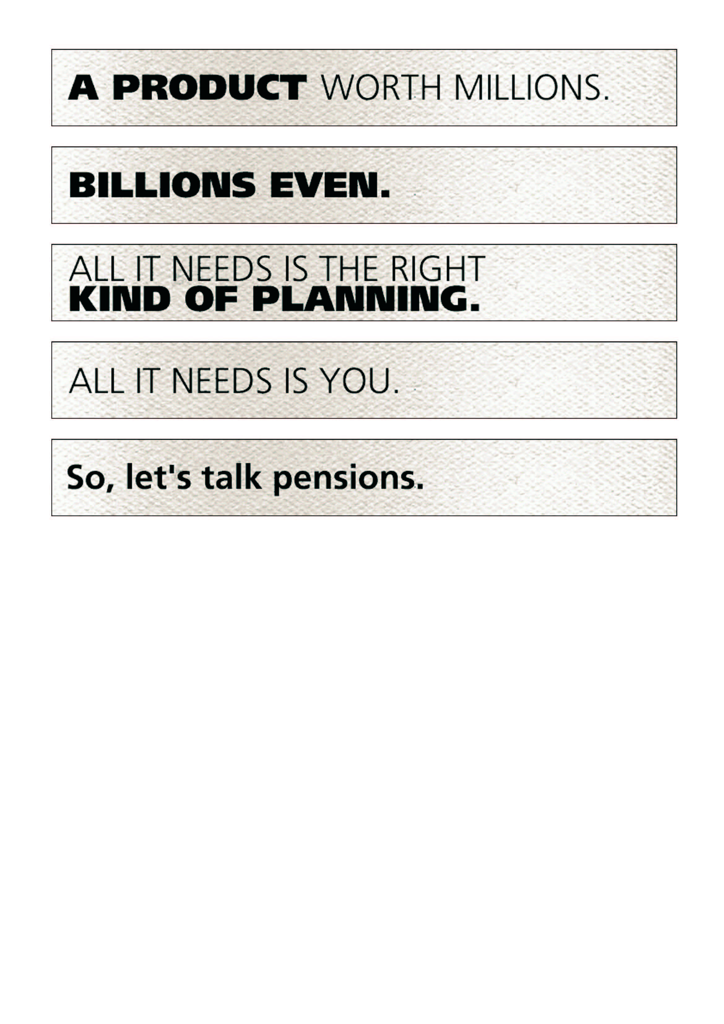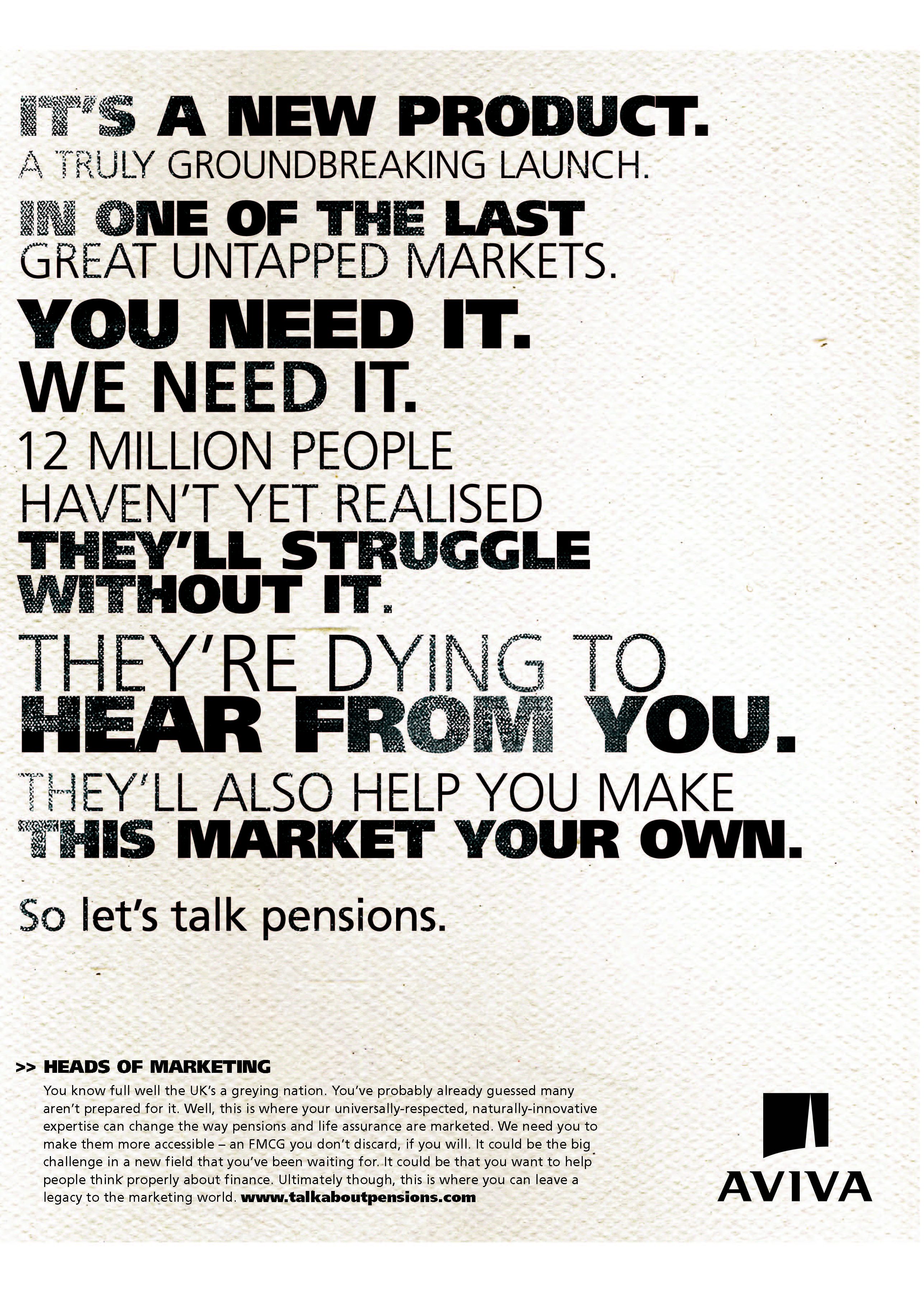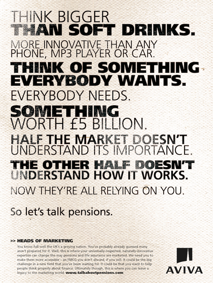 When Aviva were struggling to find talented marketers to join their pensions team, we ramped up the facts of the matter, but in a tone and with a reveal that makes the reader see the industry in a new light.